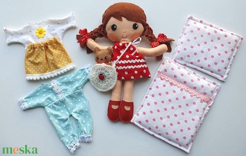 Pöttyös Panni- öltöztethető textilbaba kis macival és kiegészítőkkel (Hasonló rendelhető!)