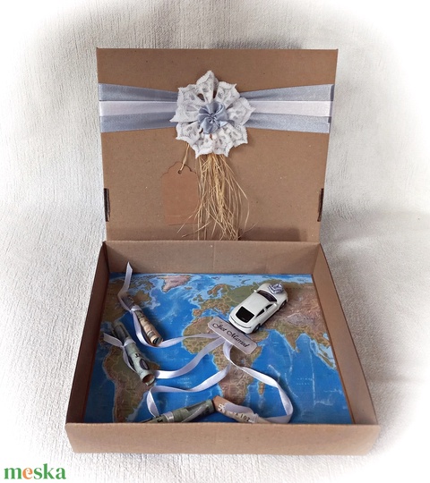 Autós pénzátadó doboz, fehér Porsche fém autóval, esküvő, nászajándék, nászút, fotótartó, boríték