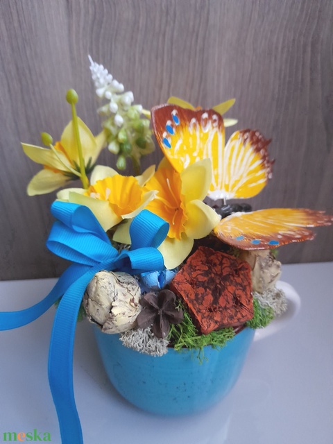 - Anyaga: kerámia, művirág, szárított növény, tűzőhab, ragasztórúd, szalag