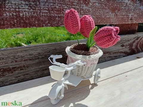 3 szál horgolt tulipán kaspóban, fehér tricikliben
