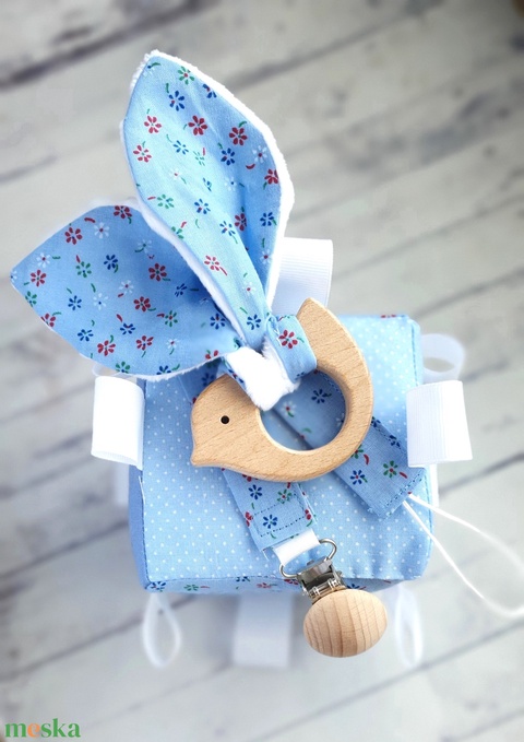 Babaköszöntő "BLUEFLOWER", babalátogató ajándék, cumilánc, rágóka, minky, babakocka, cumitartó
