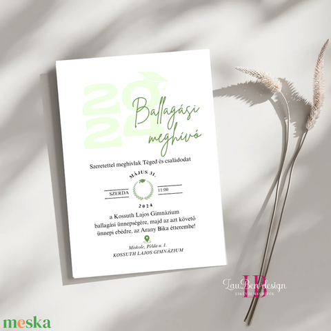 A szöveg tartalma és elrendezése módosítható a meghívón. Grafikai elemek a képen szereplő formában lesznek a kész termékeken.