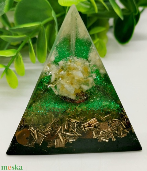 Bőség,tisztítás ,sikervonzó, védelem,nyugalom.Sungit-Orgonit gúla- citrin golyóval, peridottal, tigrisszem ásvánnya rézforgáccsal