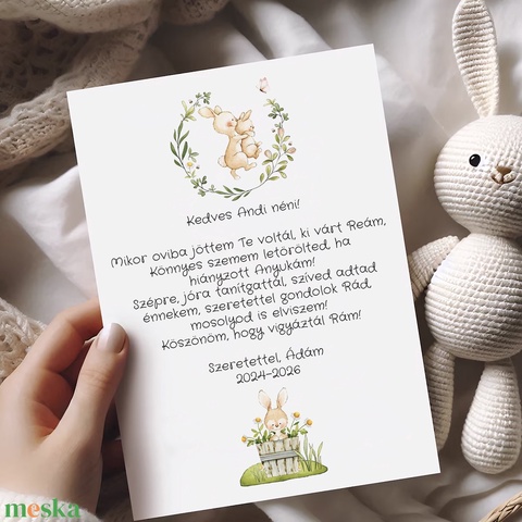 Névre szóló, pedagógus búcsúajándék ballagásra vagy évzáróra, köszönőkártya óvó- és tanár néniknek/bácsiknak, pedagógusoknak, tanároknak, oktatóknak, osztályfőnököknek, bölcsis néniknek, dajkáknak, nevelőknek. Kedves nyuszival illusztrált köszönőkártya ballagásra vagy évzáróra az ajándékod mellé.