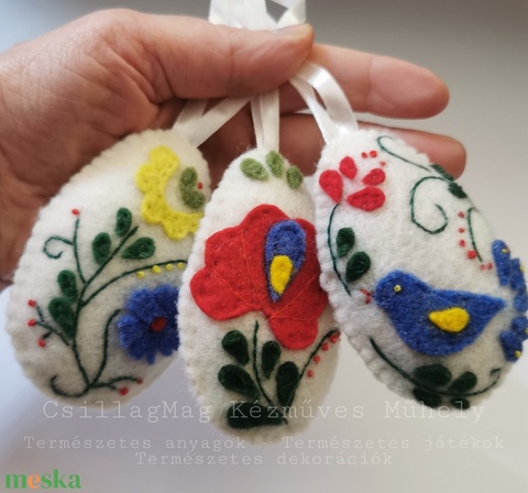 HÚSVÉTI TOJÁSOK HÍMZÉSSEL RÁTÉTEKKEL DÍSZÍTVE 3 DB/SZETT TERMÉSZETES DEKORÁCIÓ GYAPJÚFILC GYAPJÚ SZATÉNSZALAG AKASZTÓVAL