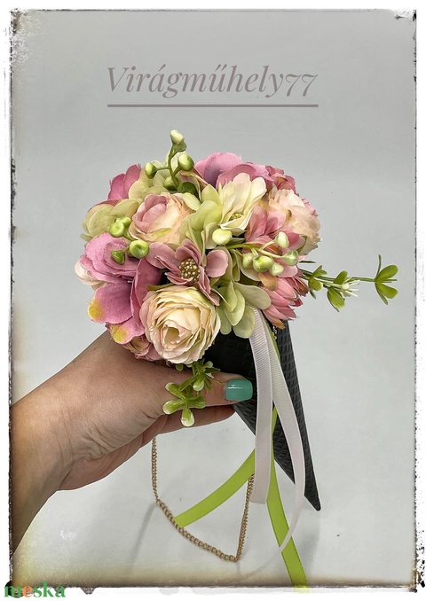 műanyag viragtölcsér, fém lánc, selyemvirág, selyemszalg