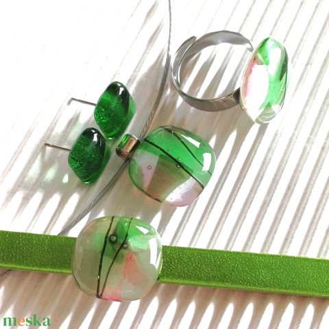 NEMESACÉL - Vadrózsa kocka üveg medál, karkötő, gyűrű és fülbevaló, üvegékszer szett