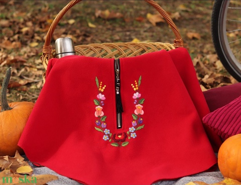 Kapucnis, poncsó piros színben, cipzárral. Kézzel hímzett virágos kalocsai mintával a cipzárvonal mentén. - Méret: S