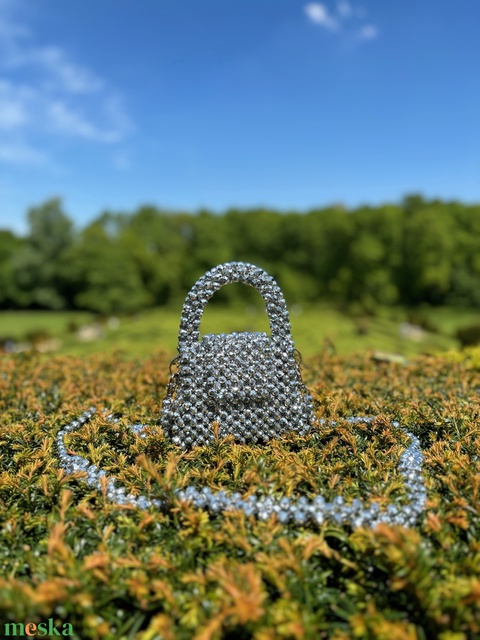 Egyedi, kézzel készült üveggyöngy táska eladó. A táska ezüst színű mágnesszárral és ezüst színű szatén belsővel rendelkezik.