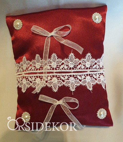 Bordó gyűrűpárna szalaggal, csipkével és gyönggyel díszítve