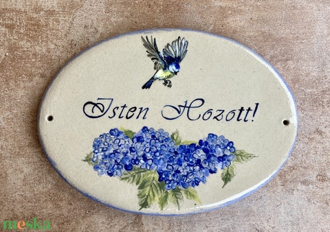 Ovális formájú Isten hozott! tábla hortenziával, cinegével