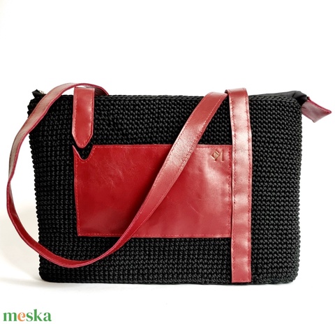 Poliészter fonalból készült horgolt, nagyobb méretű táska, valódi bőr kiegészítőkkel, pánttal és belső nagyobb zsebbel, valamint külső, mágneszárral zárható bőr zsebbel. Cipzárral záródik. A táska mérete kb. 36x25x7 cm (szé x ma x mé). A fonal enyhe csillogása, valamint a burgundi színű bőr eleganciát kölcsönöz a táskának, így akár munkában, vagy egy rohanós hétköznapon is tökéletes társ lehet.
