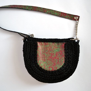 Horgolt félkör válltáska, valódi bőr kiegészítőkkel, láncos pánttal