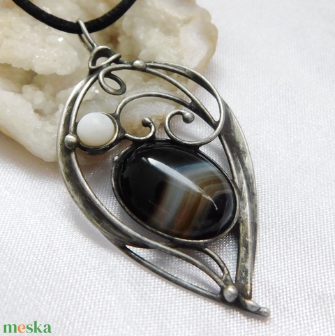 A medál Tiffany technikával készült, ónix, gyöngyház, réz és ólommentes, ezüsttartalmú ón felhasználásával. A díszítés szintén saját készítésű, nem tartalmaz gyári elemeket. A fémrészt óezüstre patináztam és lelakkoztam, hogy sokáig szép maradjon.