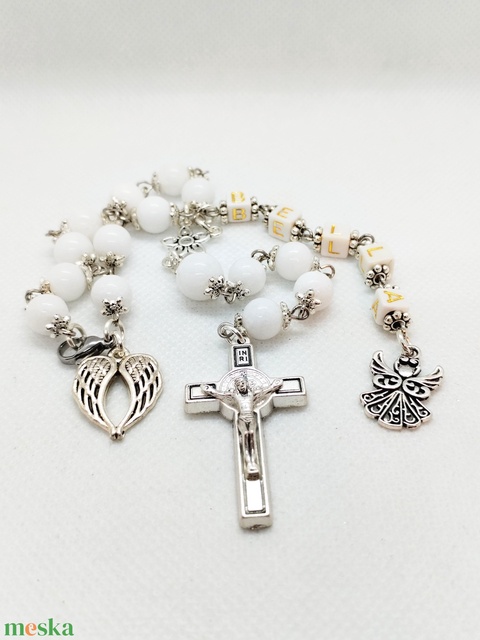 8mm -es ásványgyöngyből készül, a fém részek nikkelmentesek. A medál fém ötvözet, szépen kidolgozott, nem elnagyolt, olasz mesterek munkája. A kereszt, a köztesek, illetve a betűgyöngyök formája változó lehet, a készlet függvényében, de ez az ékszer jellegén nem változtat.
