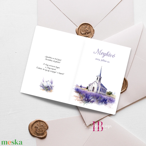 ❤️ Klasszikus Templomos Esküvői Meghívó – Levendula Mezővel, Galambokkal és Ikonos Idővonallal.