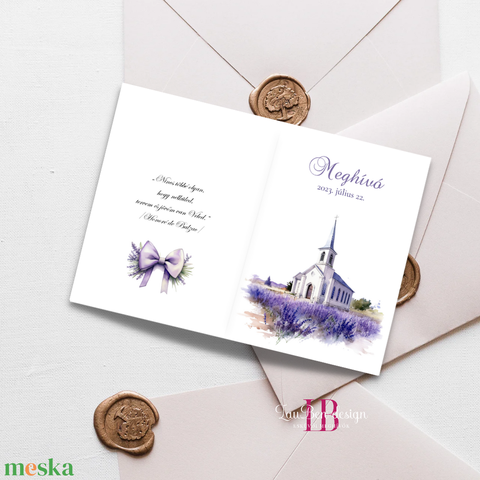 ❤️ Provence-i stílusú levendulás esküvői meghívó – akvarell templom grafikával és programtervvel, idővonallal.
