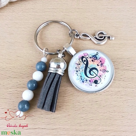 Violinkulcs szürke bojtos üveglencsés kulcstartó táskadísz pedagógusnak nőnek karácsonyra pedagógusnapra ajándék
