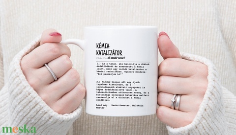Keresed a tökéletes ajándékot kémiatanárodnak? Ez a személyre szabható bögre ideális választás év végi ajándéknak vagy pedagógus napra. A „Kémia Katalizátor” felirat és a humoros, tanárokra szabott definíció garantáltan mosolyt csal a tanárod arcára.