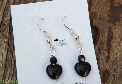 Népi jellegű fekete üveg szives fülbevaló KÉSZEN