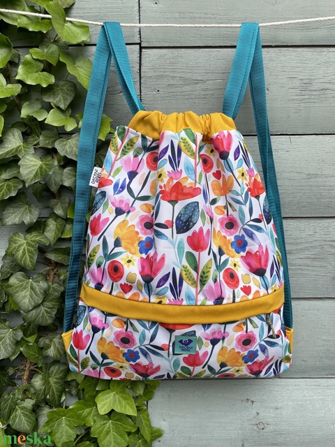 Összehúzható hátizsák színes, virágos mintával, első zsebbel - sárga/türkiz