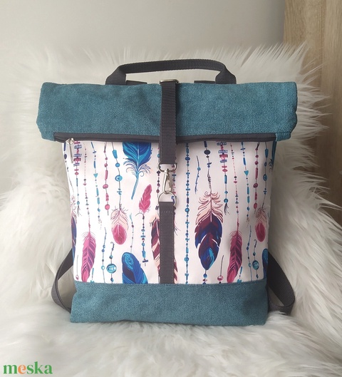 Kék rolltop hátizsák elején tollpehely mintával