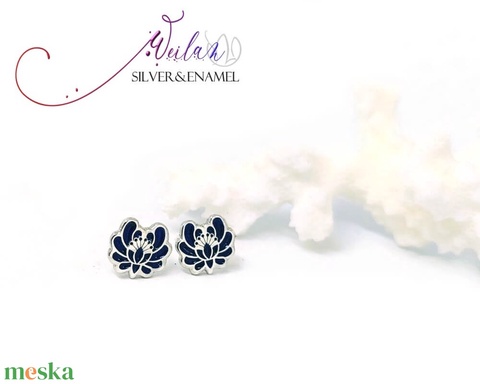 Tradició - Kalocsai - Rózsa ezüst tűzzománc fülbevaló, stiftes "pöttyfülbevaló" sötétkék
