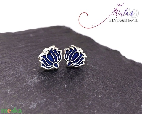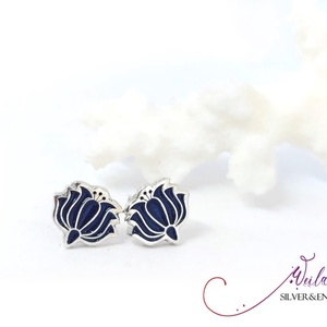 Tradició - Kalocsai - Tulipán ezüst tűzzománc fülbevaló, stiftes "pöttyfülbevaló" sötétkék