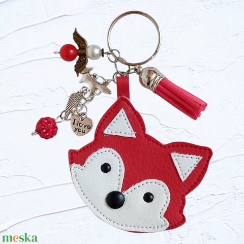 Szerencsehozó kulcstartó, táskadísz ásványgyöngyökkel - róka - piros/fehér