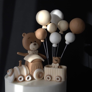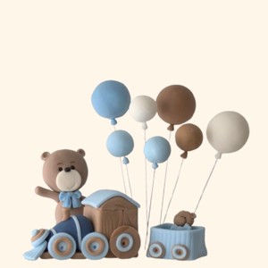 Fondant tortadísz szett: cukor vonat, maci figura és pasztell lufik – babaváró, születésnapi dekoráció