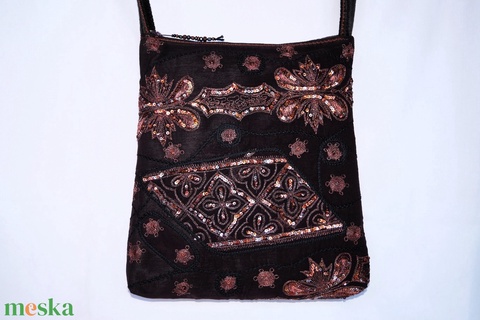 FOGLALT! Fekete, bronz, virágos indiai száriból készült, kézzel hímzett, közepes méretű cipzáros női válltáska zsebekkel