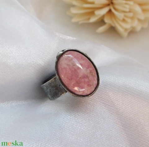 A gyűrű Tiffany technikával készült rodonit, réz és ólommentes, ezüsttartalmú ón felhasználásával. A díszítés szintén saját készítésű, nem tartalmaz gyári elemeket. A fémrészt óezüstre patináztam és lelakkoztam, hogy sokáig szép maradjon.