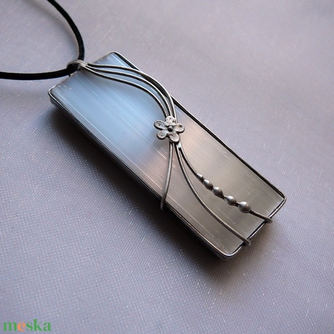 A medál Tiffany technikával készült nyers szelenit és ólommentes, ezüsttartalmú ón felhasználásával. A díszítés szintén saját készítésű, nem tartalmaz gyári elemeket. A fémrészt óezüstre patináztam, lekezeltem antioxidánssal és lelakkoztam, hogy sokáig szép maradjon.