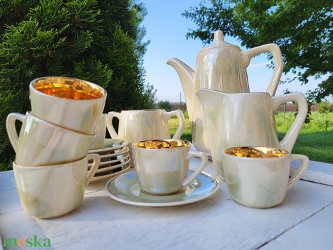 FS Stas_ritka, vintage, irizáló, lüsztermázas, aranyozott, fajansz kávéskészlet