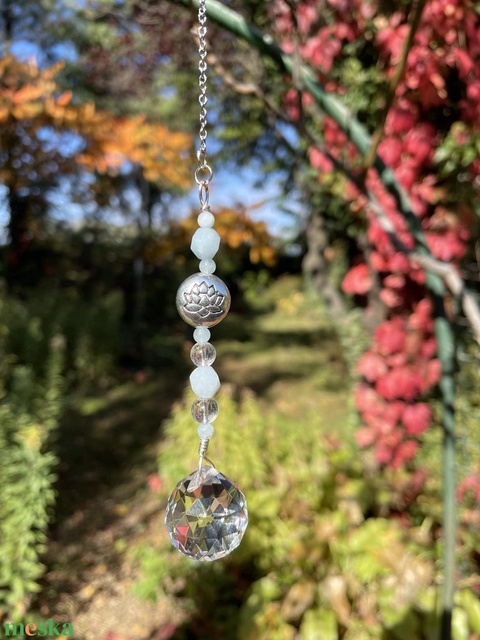 Lótuszvirág napfogó- Kék kalcit, hegyikristály és akvamarin ásványokkal