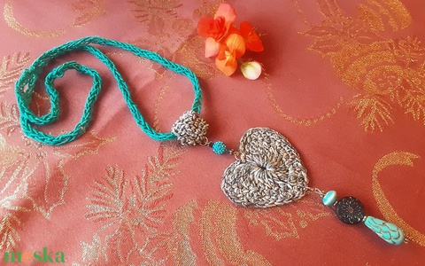 Horgolt szív medálos lánc gyöngyökkel