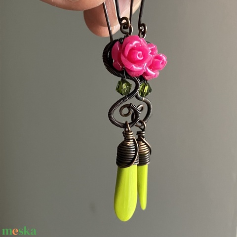 rézdrót, műgyanta rózsa, üveggyöngy, swarovski