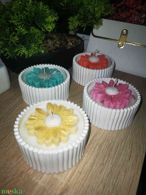 - Anyaga: szójaviasz, kanóc, olaj, virágok, színezék, festék, kerámiapor