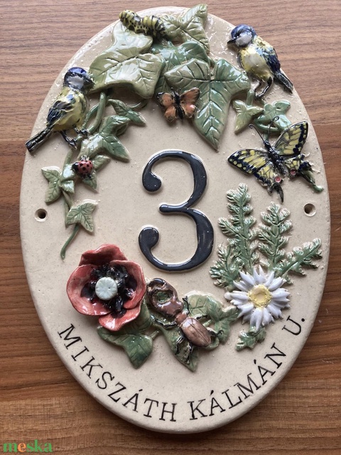 Ovális formájú házszámtábla cinkével, rovarokkal, fecskefarkú lepkével
