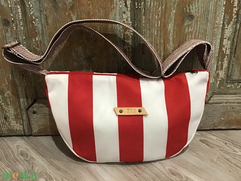 Csíkos válltáska, nyári, könnyű táska fehér, piros válltáska testen átvethető táska széles hevederrel.