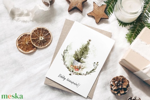 Greenery karácsonyi képeslap, üdvözlőlap, ajándékkísérő szett 3 db