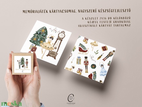 Klasszikus készségfejlesztő memóriajáték, a Diótörő mesével illusztrált karácsonyi kártyákkal varázslatot csempészhetsz az ünnepi készülődés pillanataiba. A játékot ugyanúgy kell játszani, mint bármelyik más memóriajátékot, a játék célja minél több párt megtalálni és a legtöbb lapot összegyűjteni.