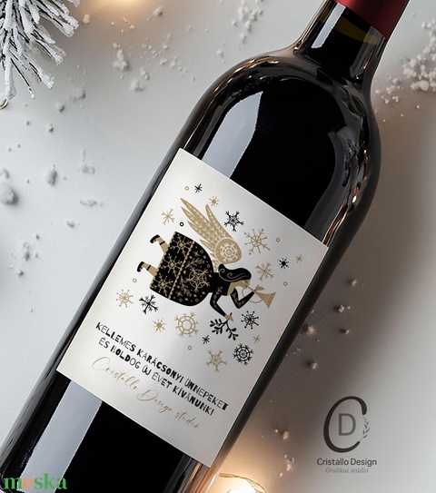 Karácsonyi borospalack címke, pálinkás címke, angyalos ajándékátadó, egyedi italos üveg matrica