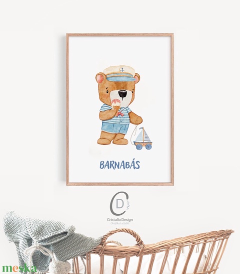 Tengerész mackóval illusztrált faliképek, amit ajándékozhatsz születésnapra, babaszületésre, keresztelőre. Ez a személyre szóló egyedi poszter szett igazi tengerparti hangulatot teremt a gyerekszobában. Remek ajándék gyerekeknek, kérhetsz rá nevet, vagy akár monogramot is, így igazán kedves, személyre szóló ajándék válhat belőle, ha babaváró partira készülsz, vagy születésnapi ajándékot keresel. Teljesen egyedi szöveg is kerülhet a képre: idézet, versike, jókívánság.
