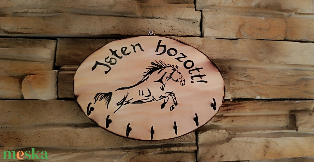Lovas fa fali kulcstartó Isten hozott felirattal