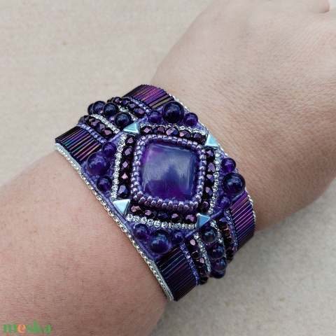 - Anyaga: ametiszt ásvány négyszögletes kaboson, ametiszt ásványgolyó gyönny, strasszlánc, cseh formagyöngy, japán kásagyöngy, bőr, alumínium, cseh csiszolt gyöngy