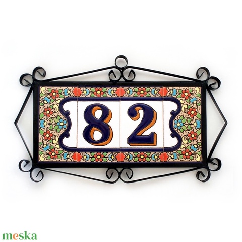 Spanyol kézműves kerámia házszám, fémkeretben