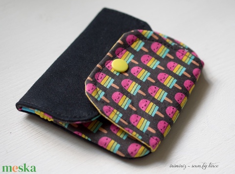 Ezt a kis pénztárcát aranyos jégkrémmintás patchwork pamutból varrtam, melyhez élénk sárga pöttyös bélést és fekete farmert társítottam.