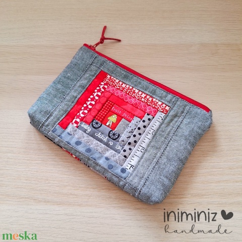Patchwork neszesszer, cipzáros tok, tartó - Piros-szürke log cabin