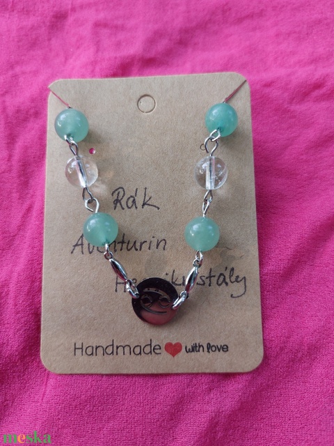 Horoszkópos karkötő 8mm-es Aventurin és Hegyikristály ásványgyöngyökkel, nemesacél horoszkópos köztessel, delfinkapoccsal, lánchosszabbítóval